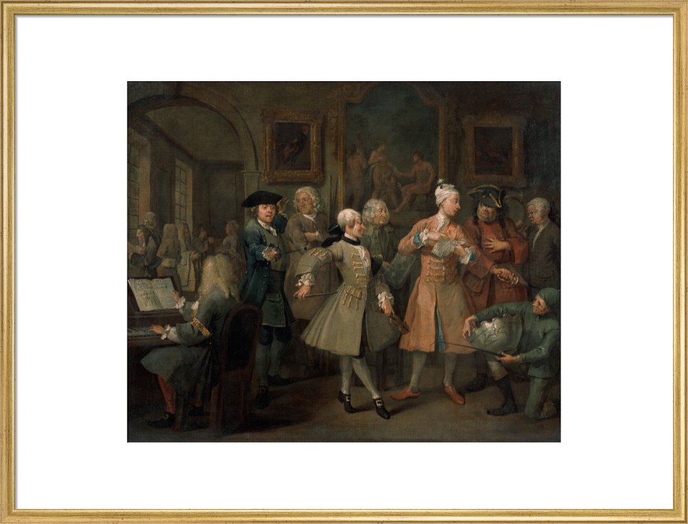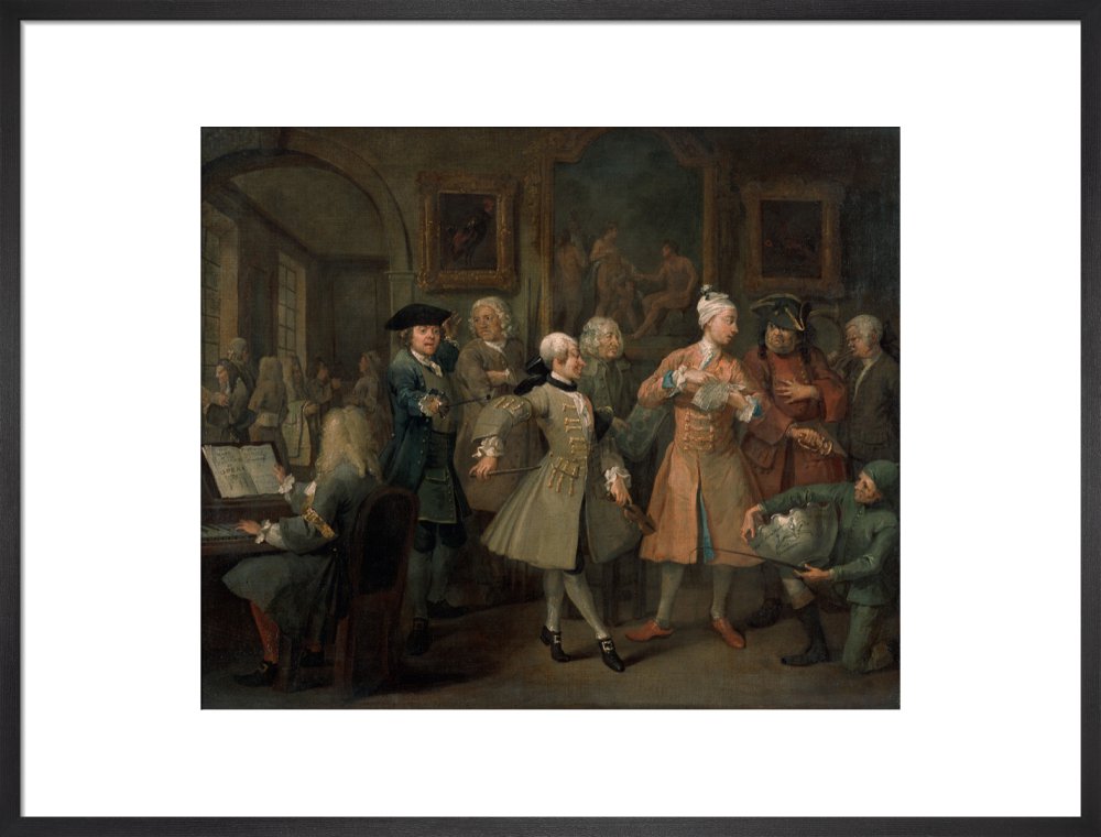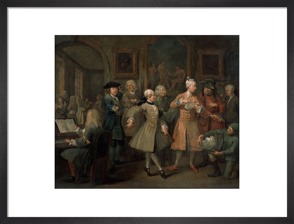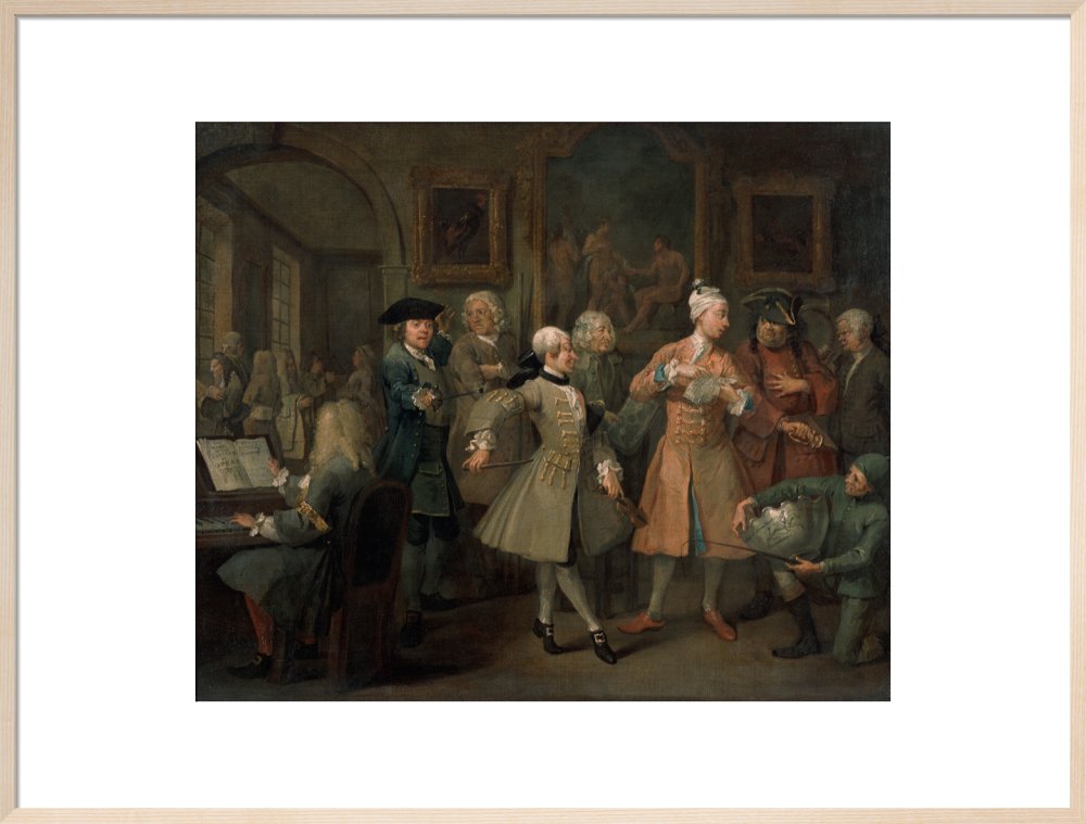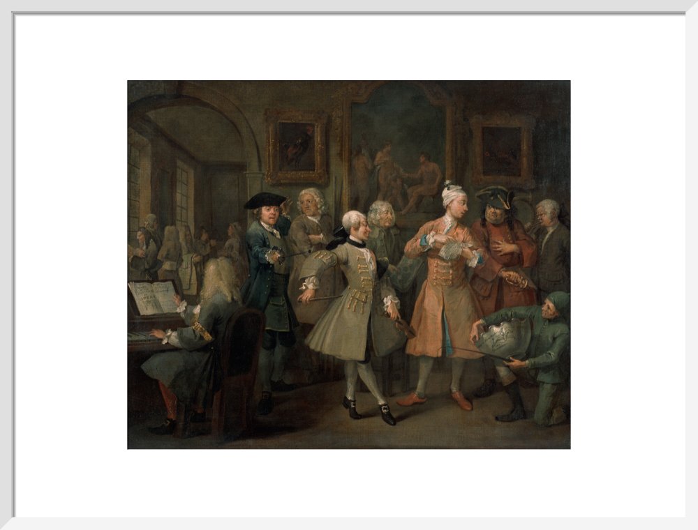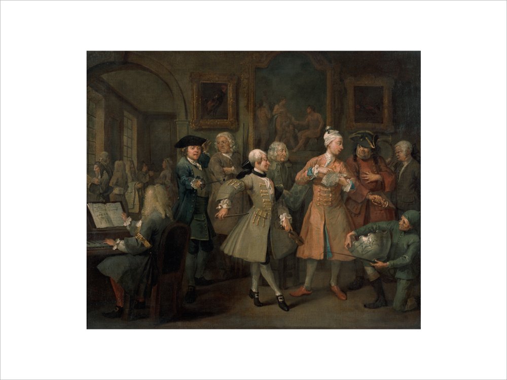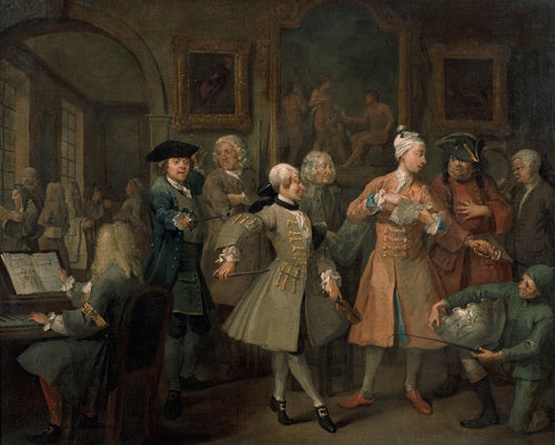 The second in a set of eight paintings which document the rise and fall of a young heir across London. The Rake's Progress was produced by William Hogarth between 1732 - 1734 as preparatory works for engravings published the following year.