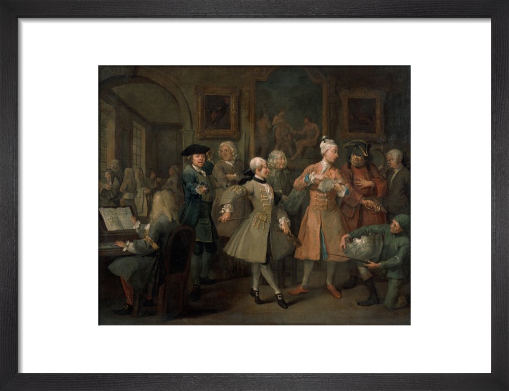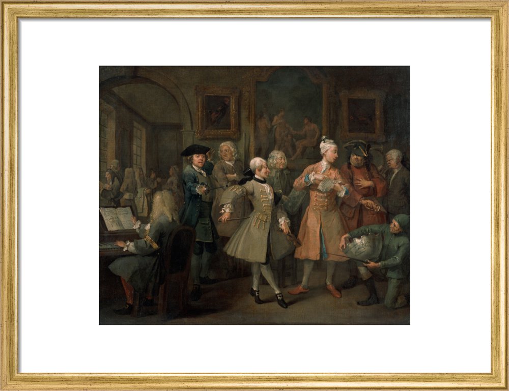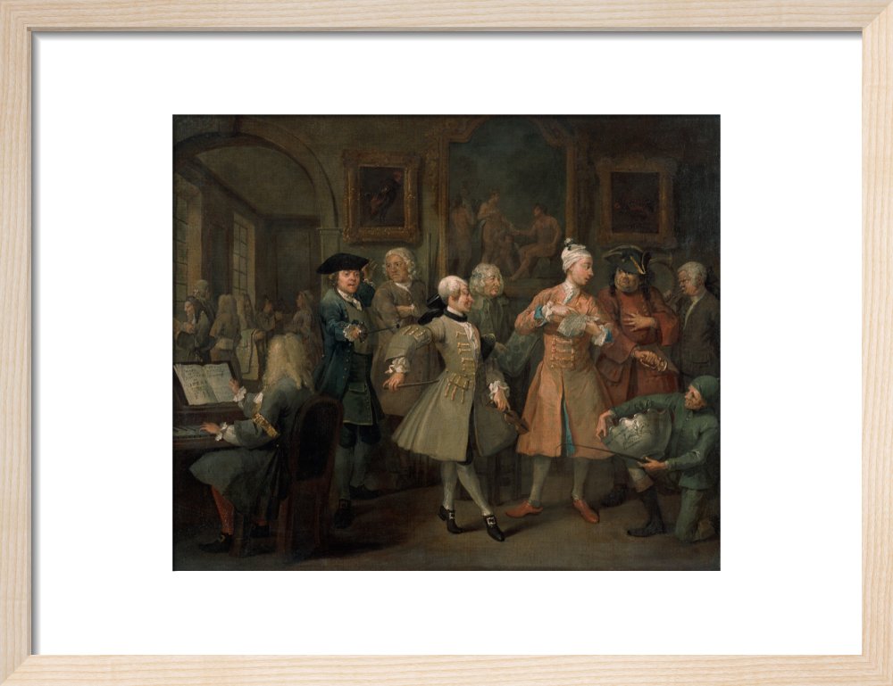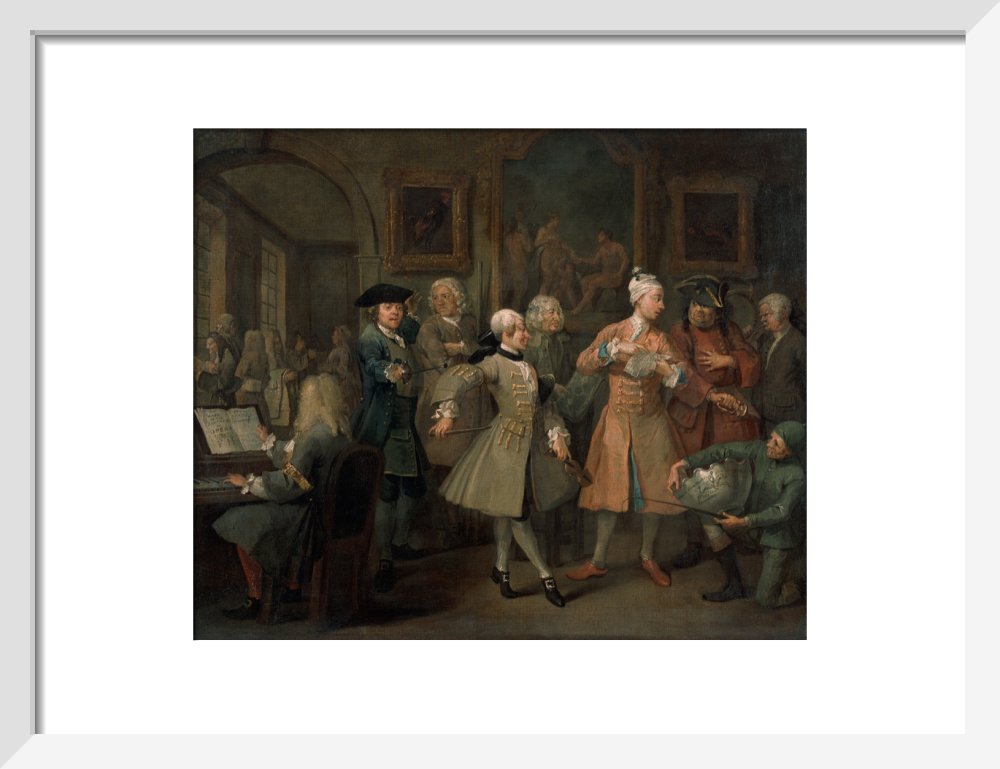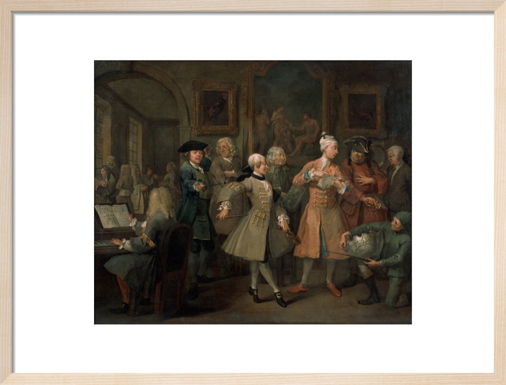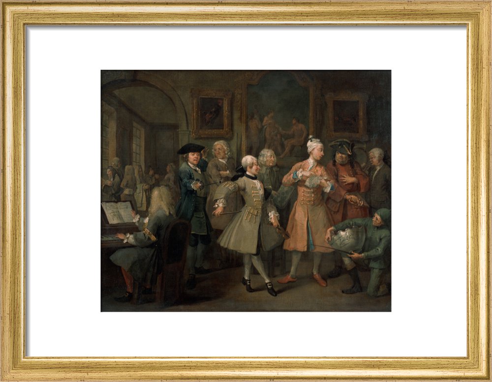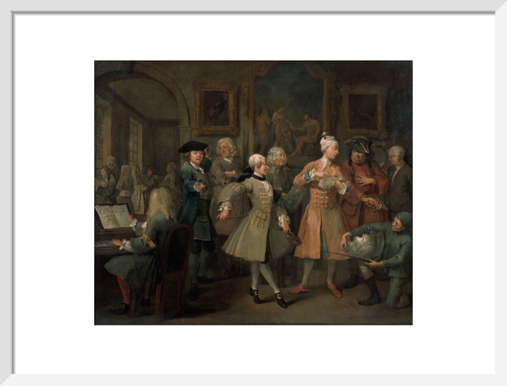 The second in a set of eight paintings which document the rise and fall of a young heir across London. The Rake's Progress was produced by William Hogarth between 1732 - 1734 as preparatory works for engravings published the following year.