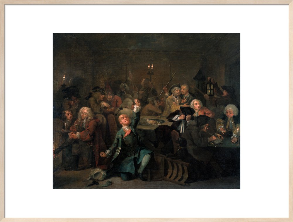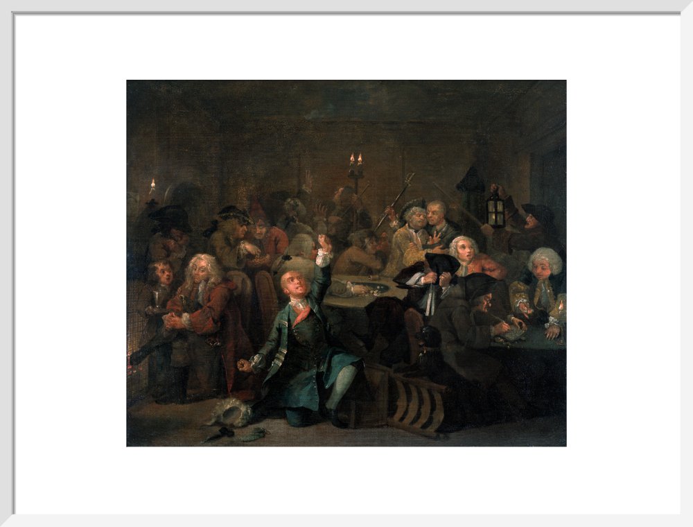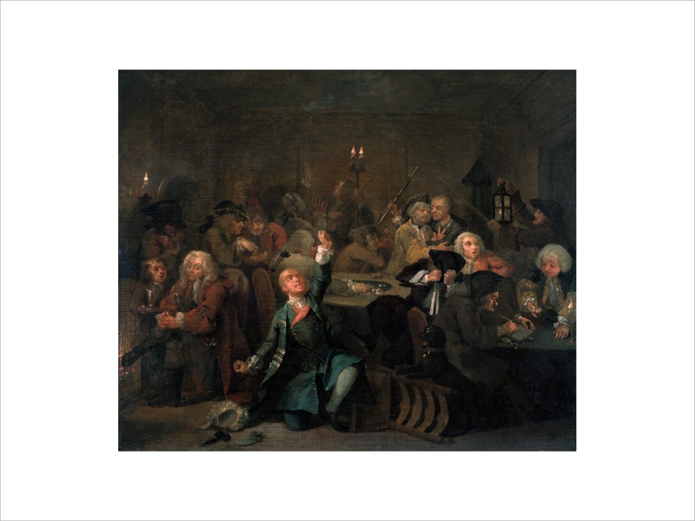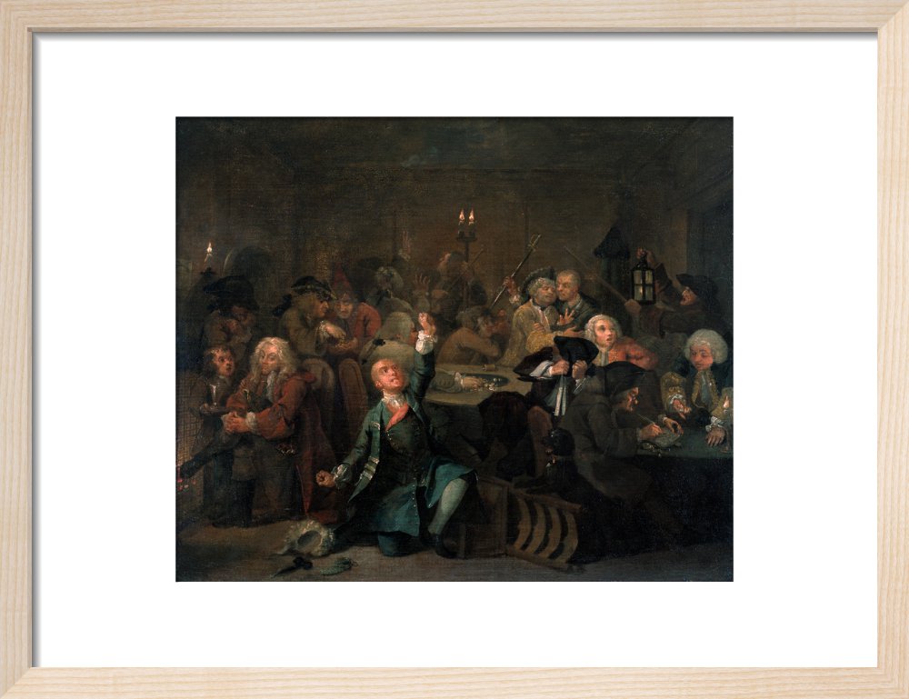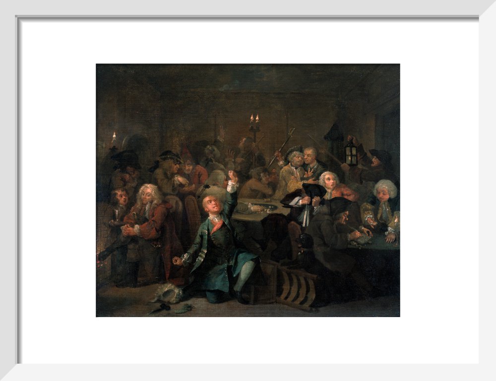 The sixth in a set of eight paintings which document the rise and fall of a young heir across London. The Rake's Progress was produced by William Hogarth between 1732 - 1734 as preparatory works for engravings published the following year.