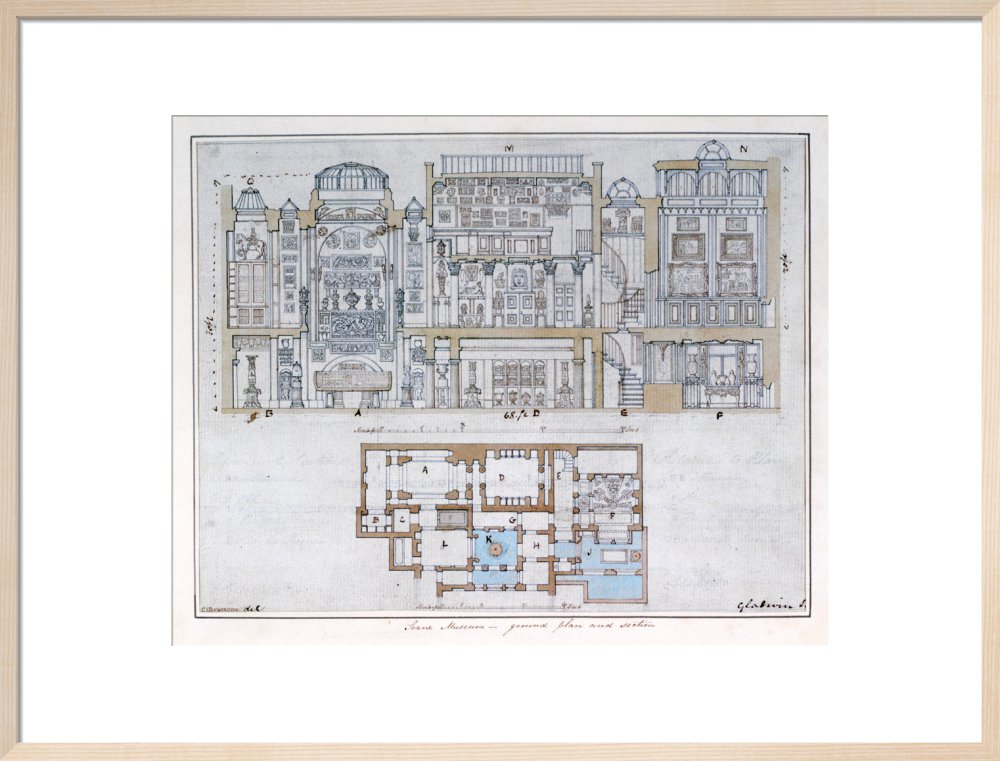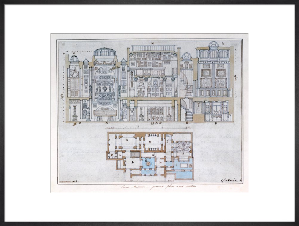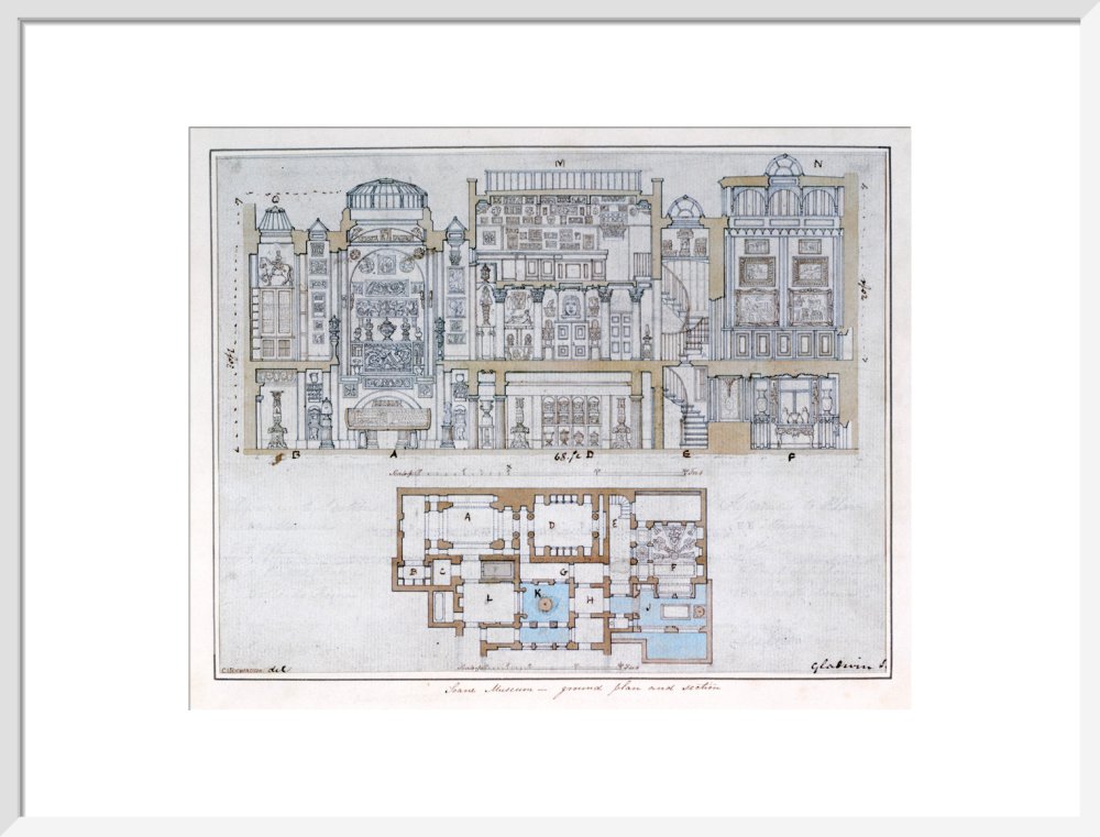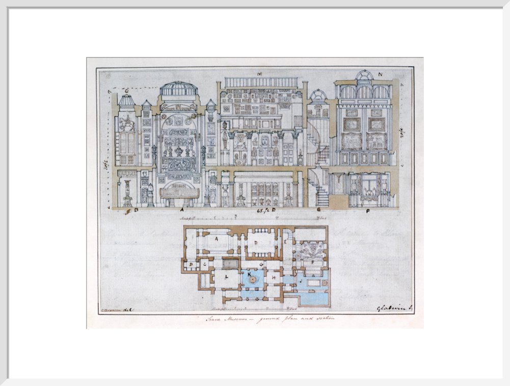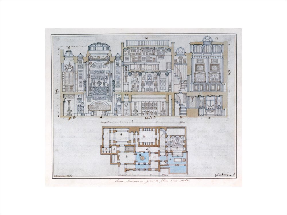 Cross-section through and plan of Sir John Soane's Museum, drawn for John Britton's The Union of Architecture, Sculpture and Painting, 1827 By Courtesy of the Trustees of Sir John Soane's Museum.This print is colour matched to the original and approved by Sir John Soane's Museum. Every purchase supports the work of the museum.