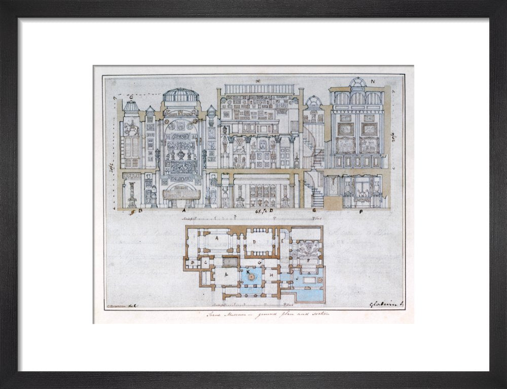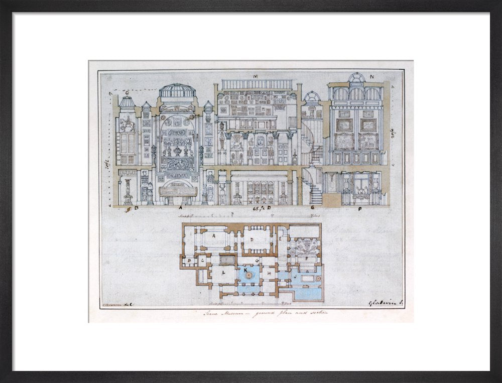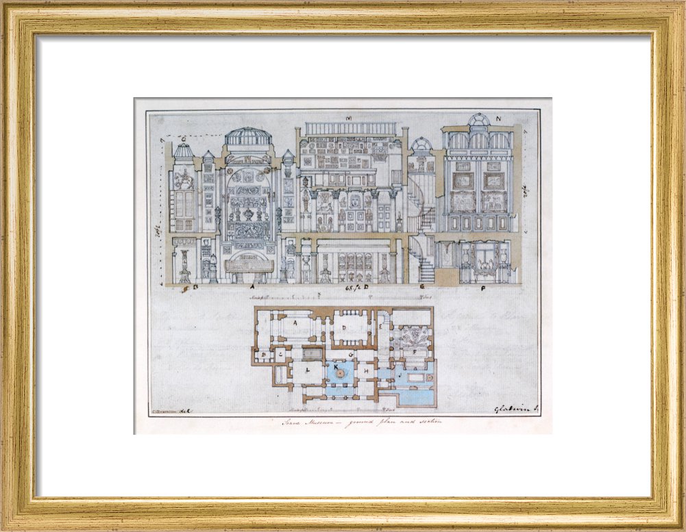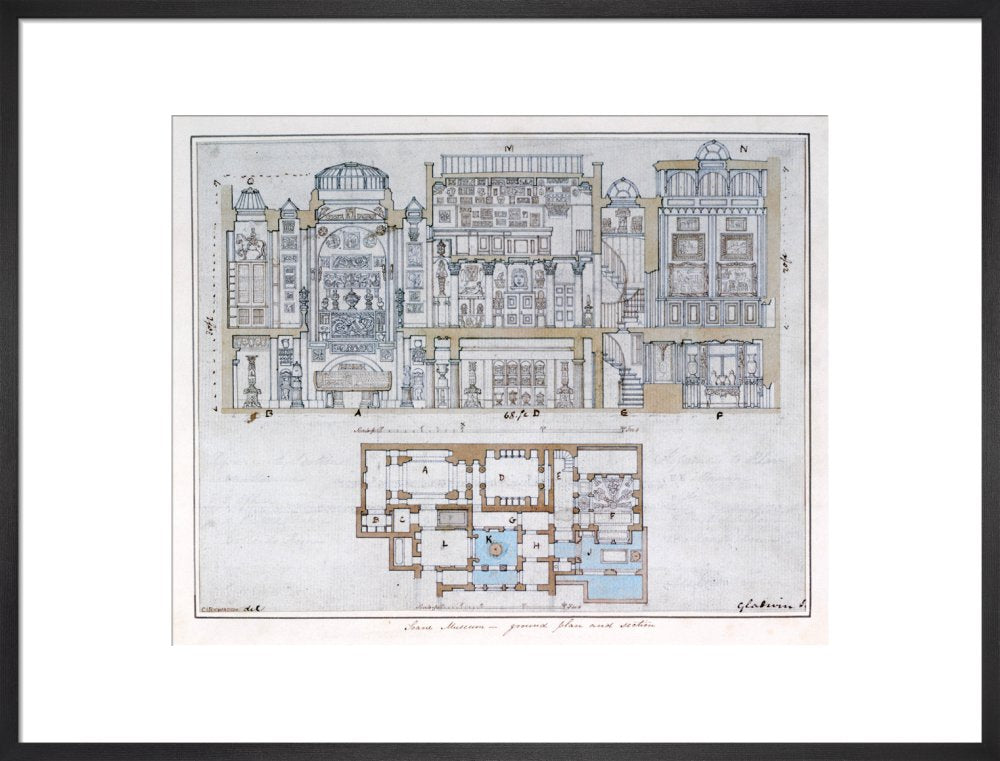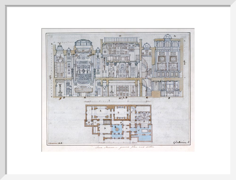 Cross-section through and plan of Sir John Soane's Museum, drawn for John Britton's The Union of Architecture, Sculpture and Painting, 1827 By Courtesy of the Trustees of Sir John Soane's Museum.This print is colour matched to the original and approved by Sir John Soane's Museum. Every purchase supports the work of the museum.