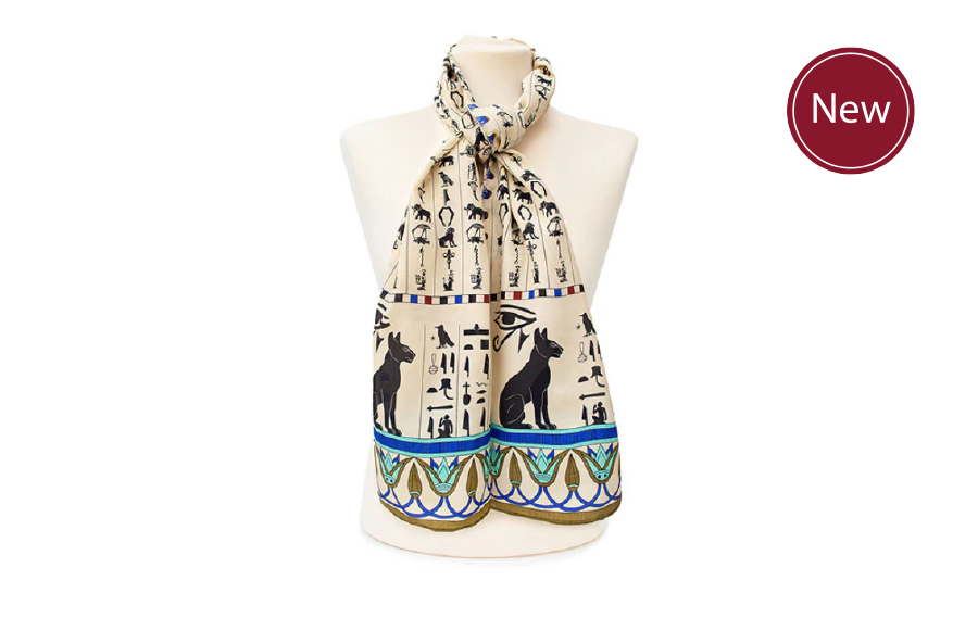 A black on cream silk crêpe de chine scarf featuring hieroglyphics and other distinctive icons of ancient Egyptian calligraphy. The scarf features the eye of Horus, the goddess Bastet, lotus flowers and other symbols.